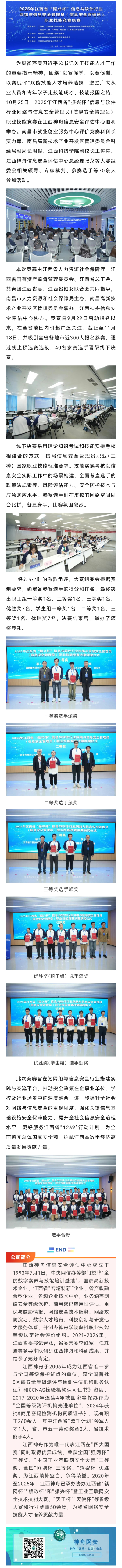 江西神舟作为唯一代表江西在“四大国赛”同时取得优异成绩,荣获全国“强网杯”三等奖、“中国工业互联网安全大赛”二等奖、全国“网鼎杯”三等奖、“熵密杯”优胜奖,为江西填补空白,争得荣誉。2020年至2025年,江西神舟已承办协办江西省“赣网杯”“赣政杯”和“振兴杯”暨工业互联网安全技术技能大赛、“天工杯”“天使杯”等省级大赛和行业赛事50余场,为我省网络安全技能人才培养贡献力量。