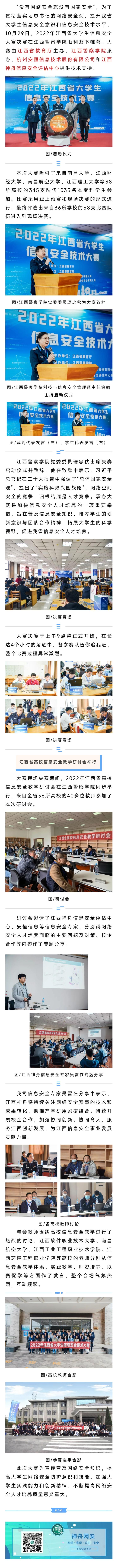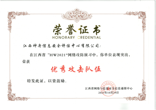 江西神舟作为唯一代表江西在“四大国赛”同时取得优异成绩,荣获全国“强网杯”三等奖、“中国工业互联网安全大赛”二等奖、全国“网鼎杯”三等奖、“熵密杯”优胜奖,为江西填补空白,争得荣誉。2020年至2025年,江西神舟已承办协办江西省“赣网杯”“赣政杯”和“振兴杯”暨工业互联网安全技术技能大赛、“天工杯”“天使杯”等省级大赛和行业赛事50余场,为我省网络安全技能人才培养贡献力量。