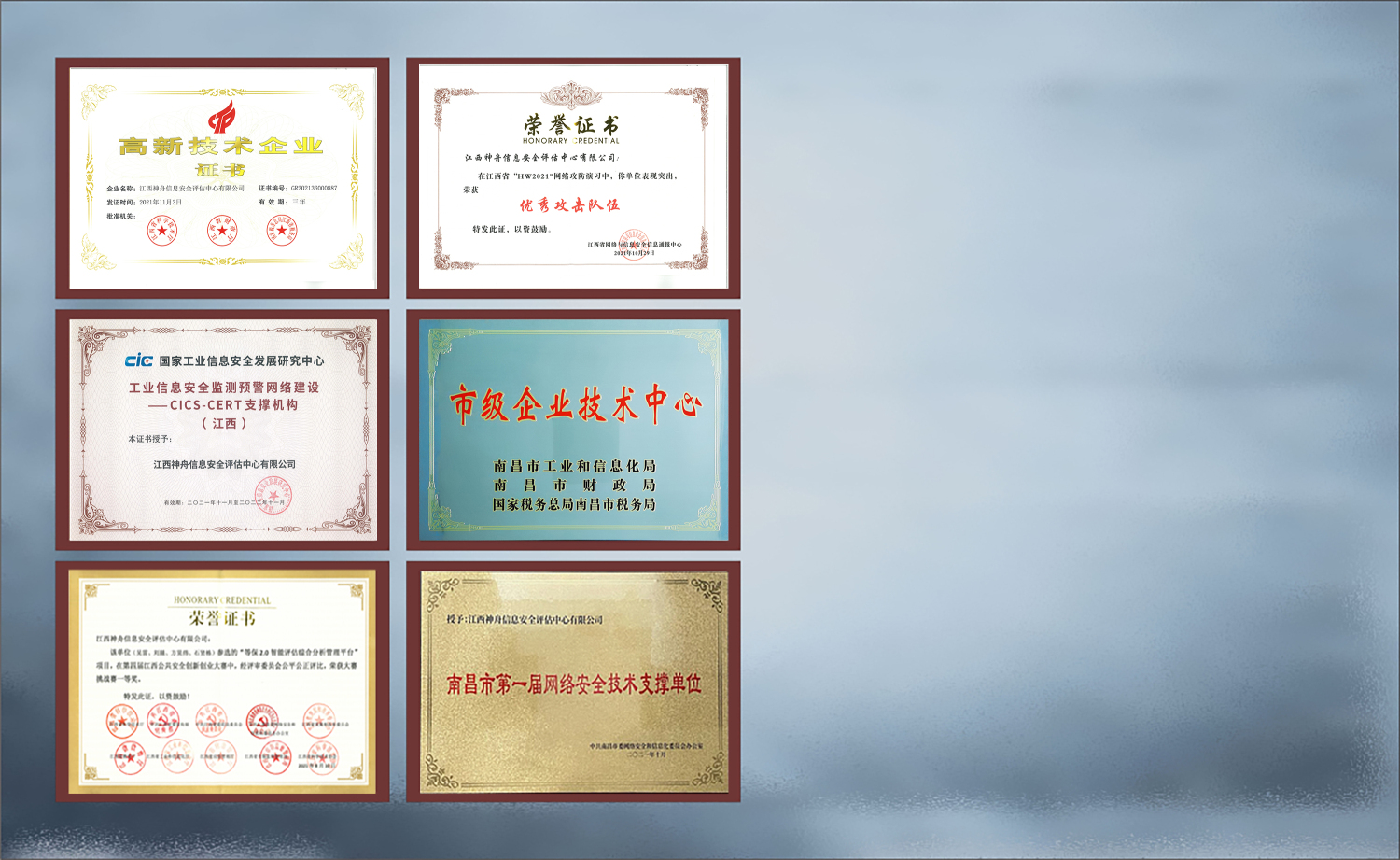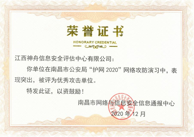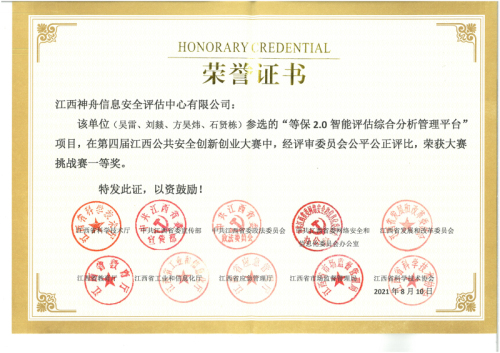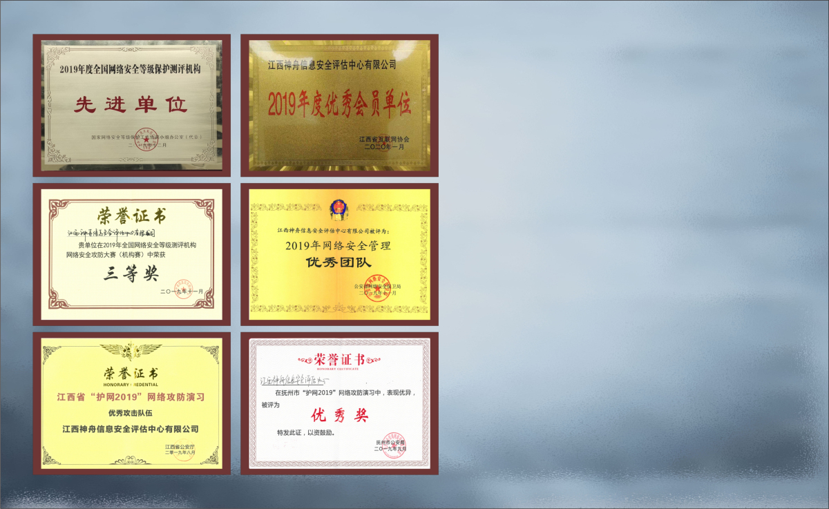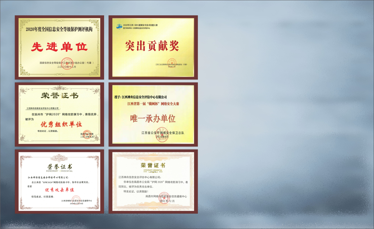 江西神舟于2006年成为江西省唯一参与全国等级保护试点的单位,获全国首批《网络安全等级测评与检测评估机构服务认证》和《CNAS检验机构认可证书》资质,2017-2020年连续4年被国家等保办评为“全国等级测评机构先进单位”,2024年获批《商用密码检测机构资质证书》,现有职工260余人,其中江西省“双千计划”领军人才1人,省、市五一劳动奖章2人,省技术能手4人。