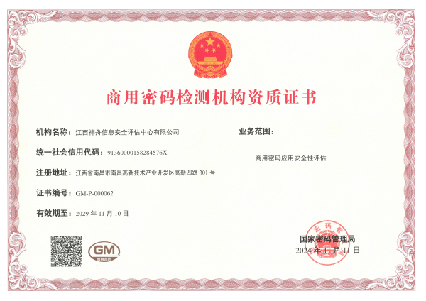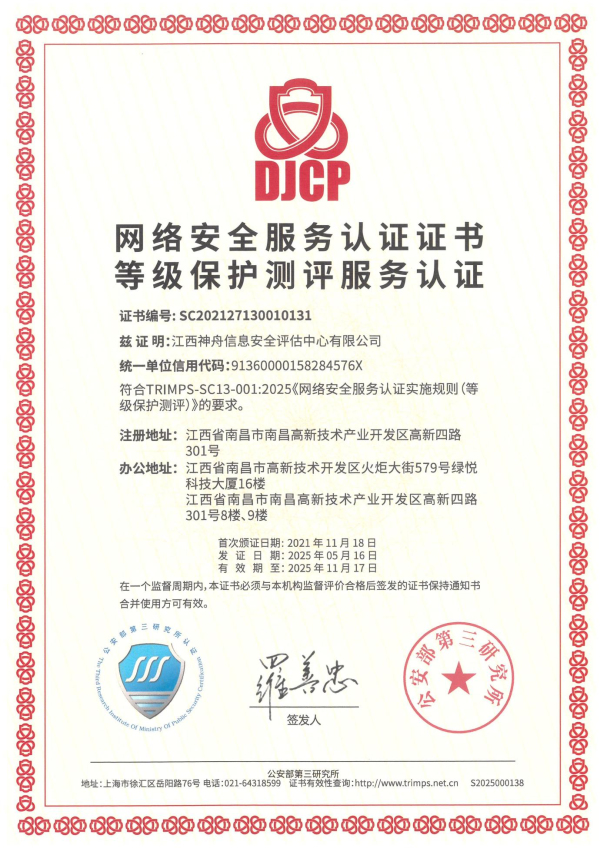 江西神舟于2006年成为江西省唯一参与全国等级保护试点的单位,获全国首批《网络安全等级测评与检测评估机构服务认证》和《CNAS检验机构认可证书》资质,2017-2020年连续4年被国家等保办评为“全国等级测评机构先进单位”,2024年获批《商用密码检测机构资质证书》,现有职工260余人,其中江西省“双千计划”领军人才1人,省、市五一劳动奖章2人,省技术能手4人。